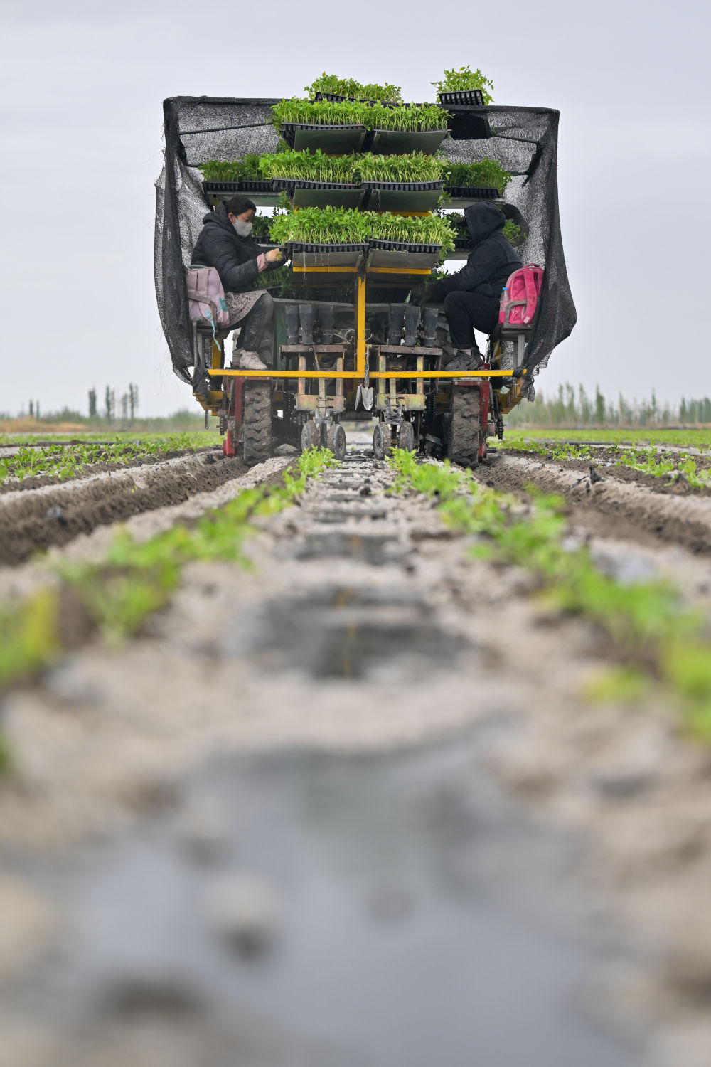 4月26日,正在新疆焉耆回族自治县四十里城子镇,农户正在从动移栽机上投放番茄苗。记者丁磊 摄。
