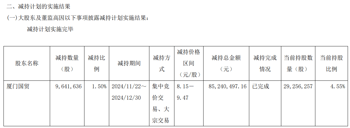 减持前,厦门国贸投资无限公司(厦门国贸)持有江西省盐业集团股份无限公司(江盐集团)无限售前提畅通股38,897,893股,占总股本的6。05%。厦门国贸于2024年11月22日至2024年12月30日通过集中竞价买卖体例减持6,427,756股,价钱区间为8。85-9。47元/股;2024年11月25日至2024年12月30日通过大买卖体例减持3,213,880股,价钱区间为8。15-8。47元/股。截至2024年12月30日,厦门国贸现实通过集中竞价体例减持6,427,756股,取打算通过集中竞价体例减持数量上限6,427,760股相差4股,系细碎股未成交所致。
