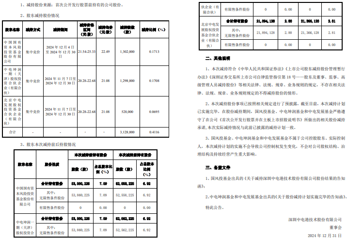 深圳中电港手艺股份无限公司(中电港)股东中国国有本钱风险投资基金股份无限公司(简称:国风投基金)打算通过集中竞价买卖体例和大买卖体例合计减持不跨越1,302,053股,即不跨越总股本的0。1713%;股东中电坤润一期(天津)股权投资合股企业(无限合股)(简称:中电坤润基金)和中电成长股权投资基金合股企业(无限合股)(简称:中电成长基金)打算通过集中竞价买卖体例减持合计不跨越1,831,337股,即不跨越总股本的0。2410%。中电坤润基金取中电成长基金为分歧步履人。截至目前,国风投基金通过集中竞价体例累计减持1,302,000股;中电坤润基金和中电成长基金通过集中竞价体例累计减持1,826,000股,前述减持打算已实施完成。