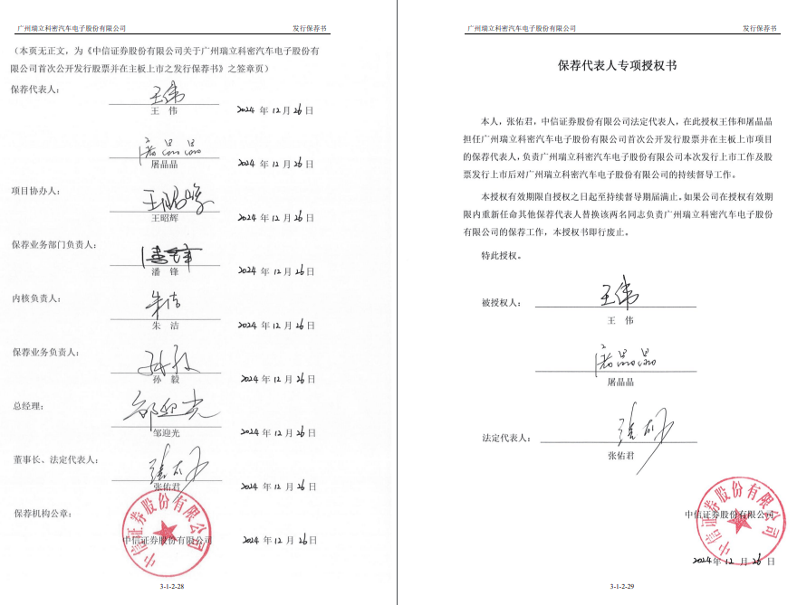 中信证券指定王伟、屠晶晶为广州瑞立科密汽车电子股份无限公司初次公开辟行股票并正在从板上市项目标保荐代表人;指定王昭辉为项目协办人,指定李阳、齐玉祥、陈俊杰、蒋宏图、陈才泉为项目组其他。