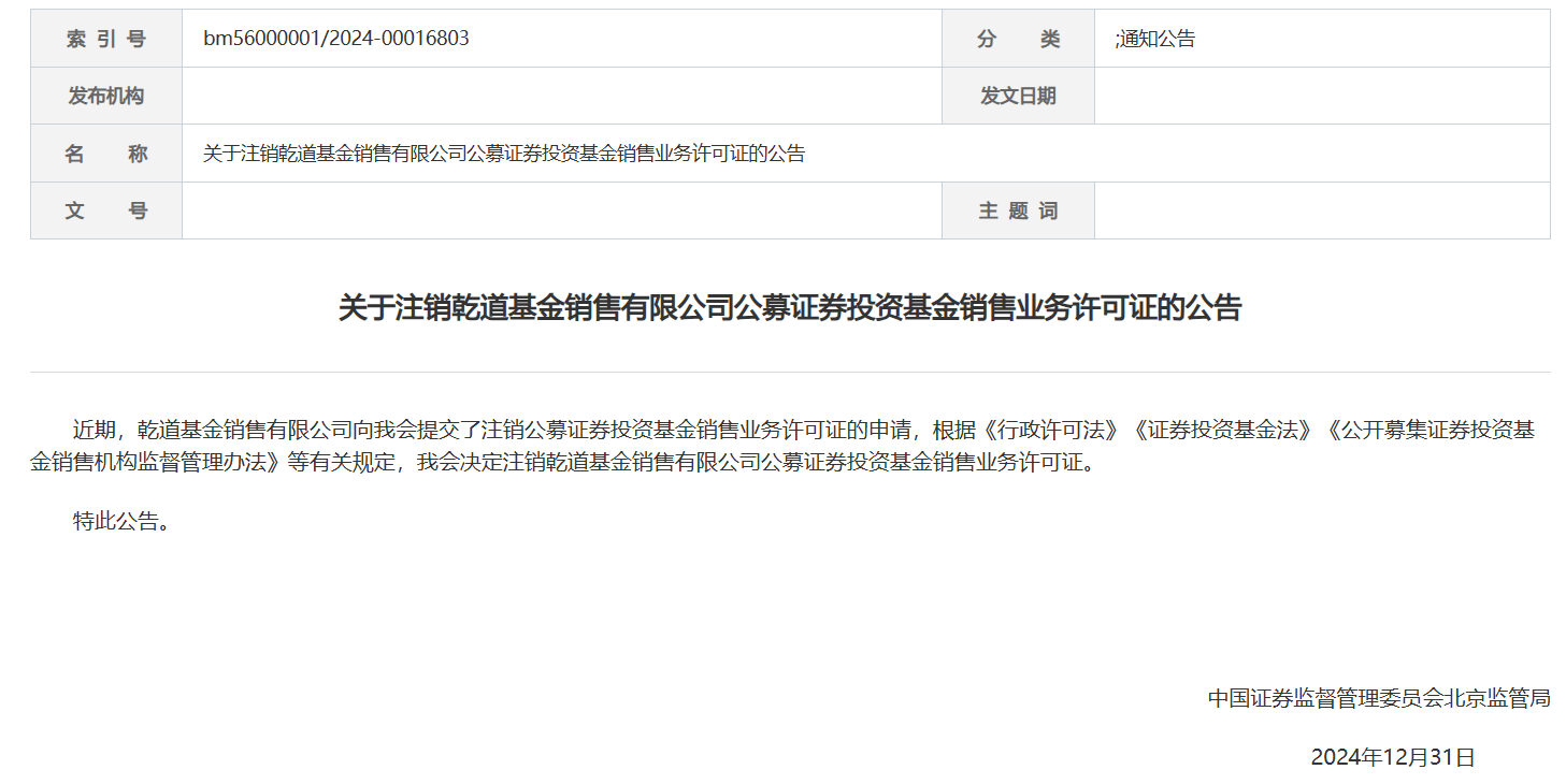 近期,乾道基金发卖无限公司向我会提交了登记公募证券投资基金发卖营业许可证的申请,按照《行政许可法》《证券投资基金法》《公开募集证券投资基金发卖机构监视办理法子》等相关,我会决定登记乾道基金发卖无限公司公募证券投资基金发卖营业许可证。