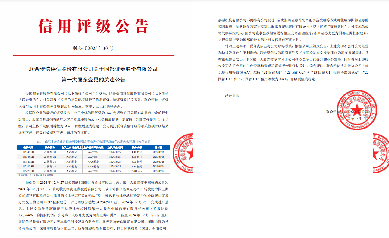 针对上述事项,结合资信已取公司取得联系,按照公司反馈及通知布告,上述变更不会对公司运营和持续成长发生晦气影响。结合资信认为浙商证券及其现实节制人交投集团做为浙江省属国企,具有很强分析实力,本次序递次一大股东变动有益于公司焦点合作力的提拔和营业成长,同时将对上述股权变动之后公司的出产运营和办理运营环境变化连结关心。分析评估,结合资信决定维持公司从体持久信用品级为AA+,维持“22都城G1”“22都城G2”和“23都城G1”信用品级为AA+,“22都城C1”和“23都城C1”信用品级为AAA,评级瞻望为不变。