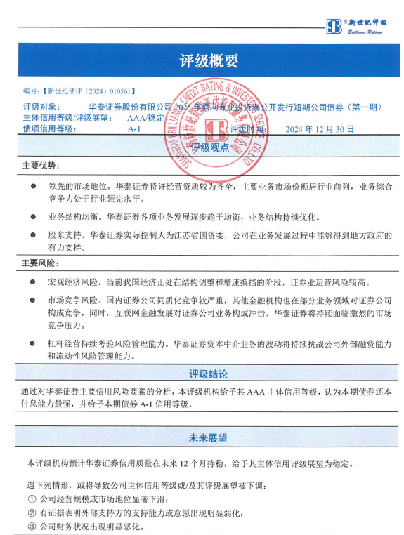 经上海新世纪评定,按照《华泰证券股份无限公司2025年面向专业投资者公开辟行短期公司债券(第一期)信用评级演讲》(新世纪债评),刊行人的从体信用品级为AAA,评级瞻望为不变,本期债券的信用品级为A-1。