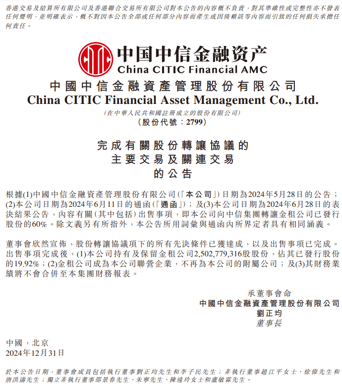 按照2024年12月27日通知布告的《都城证券关于第一大股东变动完成的通知布告》,2024年12月27日,公司收到浙商证券转发的中国证券登记结算无限义务公司出具的《证券过户登记确认书》,确认浙商证券通过特定事项和谈让渡买卖体例受让的19。97亿股股份(占公司股份总数34。2546%)已于2024年12月26日完成过户登记。上述买卖导致浙商证券持股比例跨越原第一大股东中诚信任无限义务公司的持股比例(13。3264%),公司第一大股东变动为浙商证券。截至2024年12月27日,沉庆国际信任股份无限公司、天津沉信科技成长无限公司、沉庆嘉鸿盛鑫商贸无限公司、深圳市远为投资无限公司、深圳中峻投资无限公司、国华能源投资无限公司、同方立异投资(深圳)无限公司、嘉融投资无限公司不再持有公司股份。后续浙商证券若共同董事会改组等体例可能成为都城证券的控股股东,浙商证券的实控人浙江省交通集团无限公司(简称:交投集团)可能成为公司的实控人。因董事会改组需履行响应公司管理法式,浙商证券变动为都城证券控股股东、交投集团变动为都城证券实控人仍具有不确定性。
