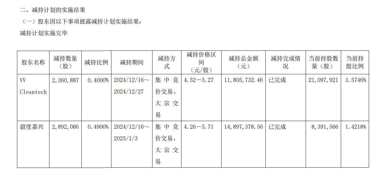减持前,电动科技股份无限公司(电动)股东VV Cleantech (HK) Limited(VV Cleantech)持有公司23,458,808股,占总股本的3。97%;股东蔚度(嘉兴)投资办理合股企业(无限合股)(简称:蔚度嘉兴)持股11,283,652股,占总股本的1。91%。上述分歧步履人合计计持有公司股份34,742,460股,占总股本的5。89%。截至2025年1月3日,股东VV Cleantech及其分歧步履人蔚度嘉兴已通过大买卖及集中竞价体例减持公司股份5,252,973股,占总股本的0。89%,本次减持打算已实施完毕。