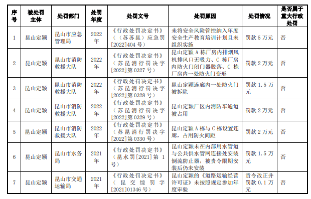 8,涉及从体:利来汽配。惩罚机关:常熟市消防救援大队苏熟消行罚决字﹝2022﹞第5169号、第5170号。(1)2022年11月28日,因3个应急照未连结无缺无效,违反了《中华人平易近国消防法》第十六条第一款第二项的,被责令整改,并惩罚款10,000元;(2)同日,因1#和5#车间之间,防火间距被货色占用,违反了《中华人平易近国消防法》第二十八的,被责令整改,并惩罚款30,000元。