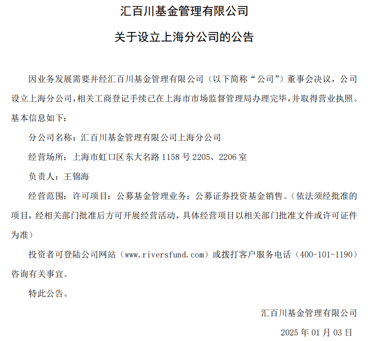 因营业成长需要并经汇百川基金办理无限公司董事会决议,公司设立上海分公司,相关工商登记手续已正在上海市市场监视办理局打点完毕,并取得停业执照。根基消息如下?。
