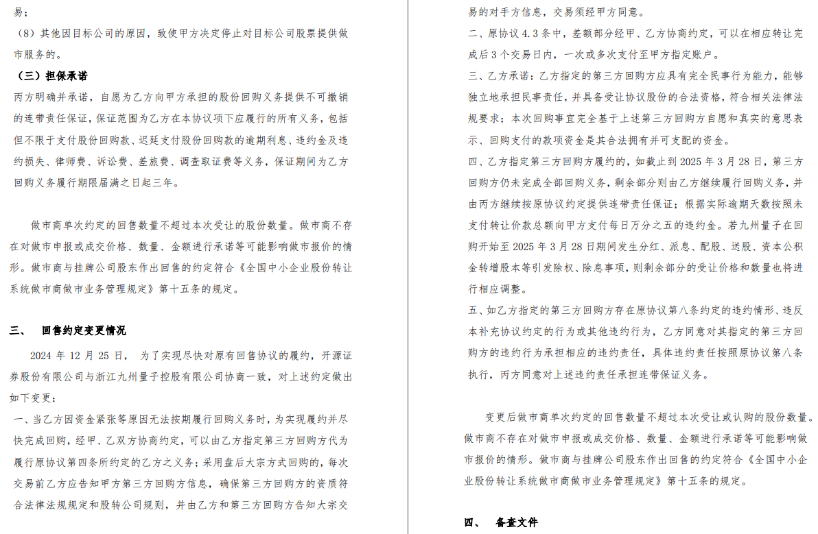 开源证券股份无限公司于2021年12月27日取浙江九州量子控股无限公司(九州量子)签定和谈,从九州量子处受让股票九州量子(证券代码:837638)300,000股。2024年12月25日,为了实现尽快对原有回售和谈的履约,开源证券取九州量子协商分歧,对上述商定做出如下变动。