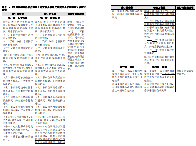 招商证券第八届董事会第十三次会议于2024年12月30日以现场连系通信体例召开。本次会议审议并通过了以下议案:(一)关于续聘公司高级办理人员的议案。续聘吴敏先生为公司总裁,续聘刘杰先生为公司副总裁(财政担任人),续聘张浩川先生、刘锐先生为公司副总裁,续聘张兴先生为公司合规总监、首席风险官,任期自2025年1月1日起大公司第八届董事会届满之日止。(二)关于续聘公司内部审计机构担任人的议案。续聘陈鋆先生为公司内部审计机构(考核部)担任人,任期自2025年1月1日起大公司第八届董事会届满之日止。(三)关于变动公司联席公司秘书的议案。1、委任黄慧儿密斯接替邝燕萍密斯为公司联席公司秘书;2、委任黄慧儿密斯为授权代表吴敏先生、刘杰先生的替任人;3、委任黄慧儿密斯为公司法令法式文件代办署理人;4、授权公司任何一名董事或公司秘书处置及施行所有相关上述变动之事宜,包罗通知联交所及相关之部分。(四)关于修订《招商证券股份无限公司董事、监事和高级办理人员所持公司股份及其变更办理轨制》的议案。(五)关于修订《招商证券股份无限公司董事会计谋取可持续成长委员会工做法则》的议案。(六)关于修订《招商证券股份无限公司董事会风险办理委员会工做法则》的议案。(七)关于修订《招商证券股份无限公司董事会提名委员会工做法则》的议案。(八)关于公司2024年三季度内部审计工做演讲的议案。(九)关于调整公司取招商局集团无限公司2022-2026年衡宇租赁框架和谈年度买卖上限的议案。