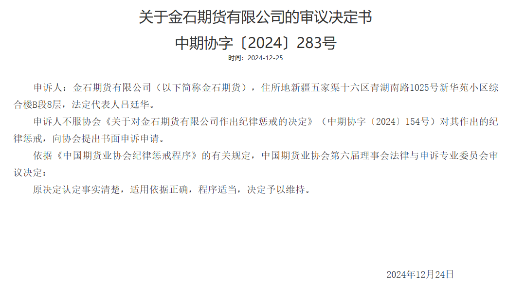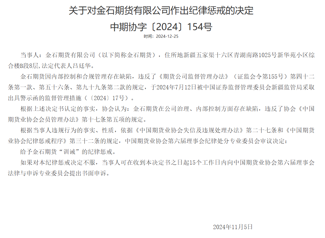 按照上述决定书认定的现实,协会认为:金石期货正在公司管理、内部节制方面存正在缺陷,违反了协会《中国期货业协会会员办理法子》第十七条第五项的。