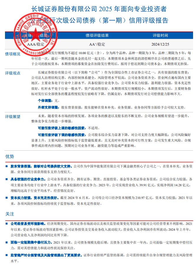 用情况进行分析阐发和评估,确定从体持久信用品级为AAA,长城证券2025年面向专业投资者公开辟行次级公司债券(第一期)信用品级为AA+,评级瞻望为不变。(结合〔2024〕11688号)。