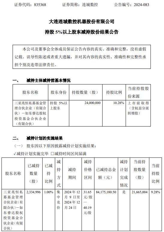 大连连城数控机械股份无限公司(连城数控)原持股10。28%的股东三亚兆恒私募基金办理合股企业(无限合股)-如东睿达股权投资基金合股企业(无限合股)减持完成。2024年12月9日至2024年12月24日期间减持2,334,996股,减持比例1。00%。当前持股比例9。28%。