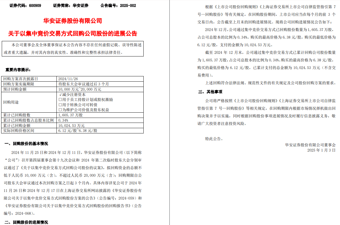 2024年12月,华安证券通过集中竞价买卖体例已回购1,605。37万股,占总股本的比例为0。34%。采办的最高价钱为6。38元/股,采办的最低价钱为6。12元/股,领取的金额为10,024。53万元。截至2024年12月末,公司通过集中竞价买卖体例已累计回购1,605。37万股,占总股本的比例为0。34%。采办的最高价钱为6。38元/股,采办的最低价钱为6。12元/股,已累计领取的总金额为10,024。53万元(不含买卖费用)。