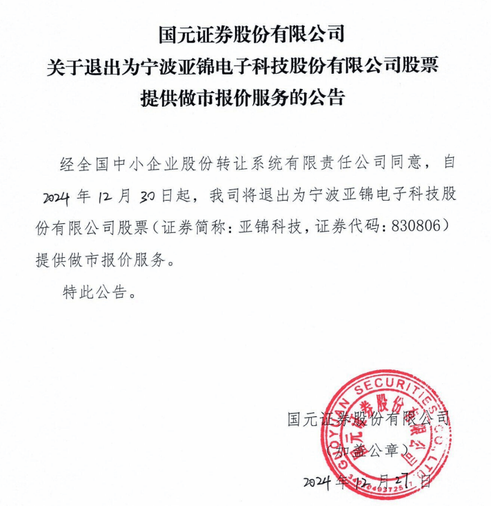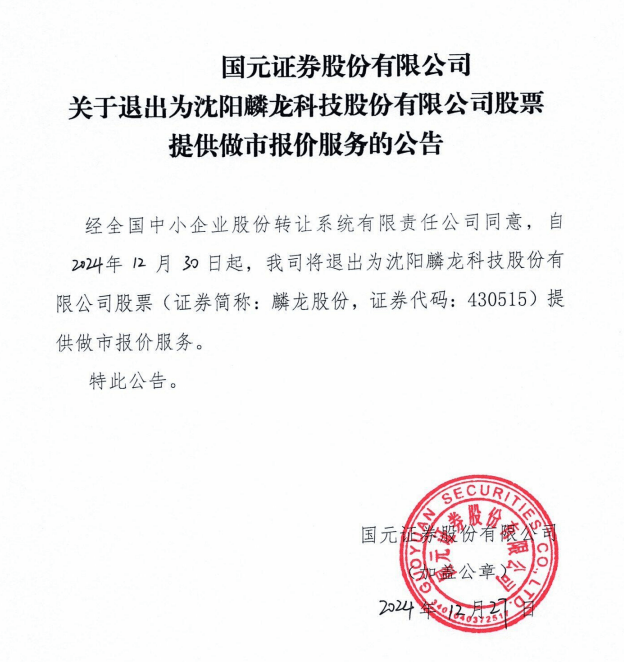 经全国中小企业股份让渡系统无限义务公司同意,自2024年12月30日起,国元证券退出为沈阳龙科技股份无限公司股票(证券简称:麟龙股份,证券代码:430515)供给做市报价办事。