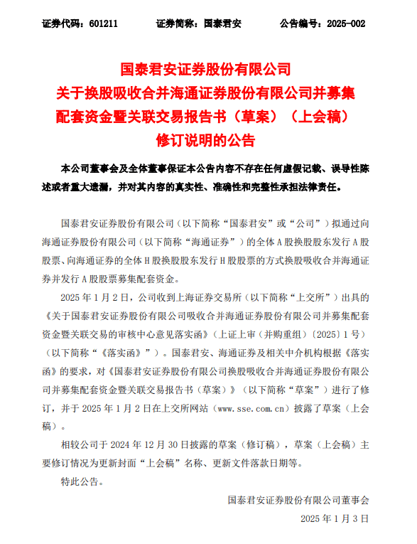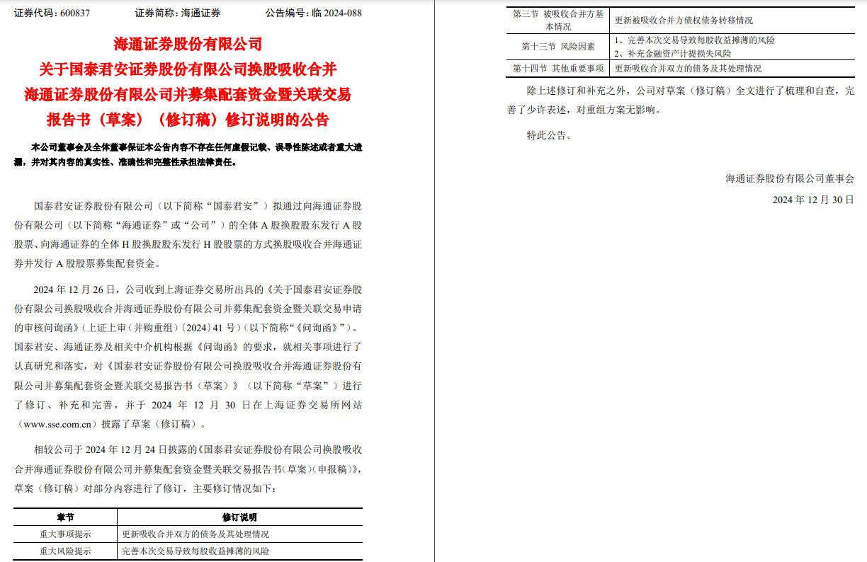 相较公司于2024年12月24日披露的《国泰君安证券股份无限公司换股接收归并海通证券股份无限公司并募集配套资金暨联系关系买卖演讲书(草案)(申报稿)》,草案(修订稿)对部门内容进行了修订,次要修订环境如下。