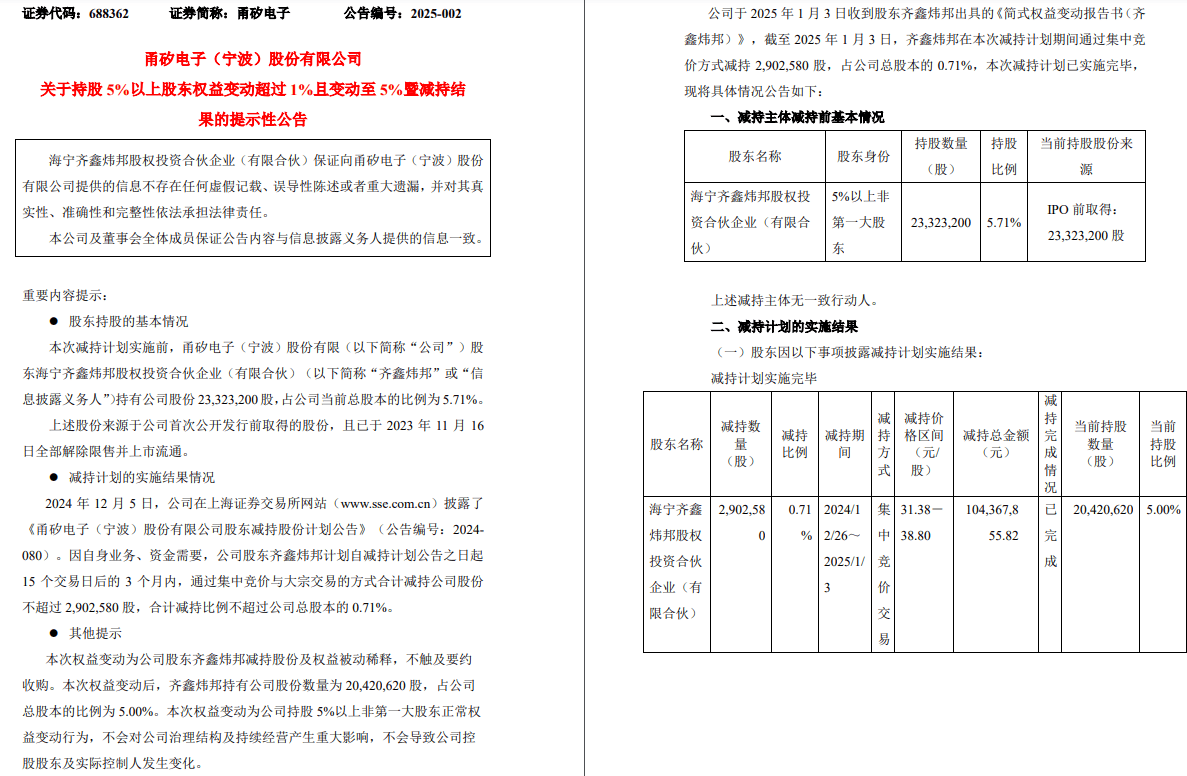 减持前,甬矽电子(宁波)股份无限公司(甬矽电子)股东海宁齐鑫炜邦股权投资合股企业(无限合股)(简称:齐鑫炜邦)持有公司股份23,323,200股,占公司当前总股本的比例为5。71%。截至2025年1月3日,齐鑫炜邦正在本次减持打算期间通过集中竞价体例减持2,902,580股,占公司总股本的0。71%,本次减持打算已实施完毕。