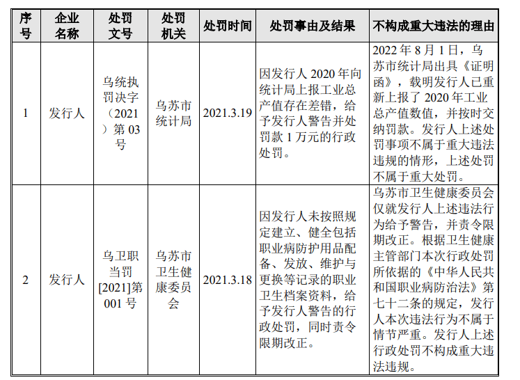 钵施然因正在2020年向统计局工业总产值存正在差错,乌苏市统计局出具《行政惩罚决定书》(乌统执罚决字(2021)第03号),对钵施然处于并罚款10,000元的惩罚。2022年1月4日,乌苏市统计局《专项证明》,认为钵施然可以或许积极共同整改并按时交纳罚款,且违法行为情节轻细,故该局认为上述事项不属于严沉违法违规的景象,上述惩罚不属于严沉惩罚。
