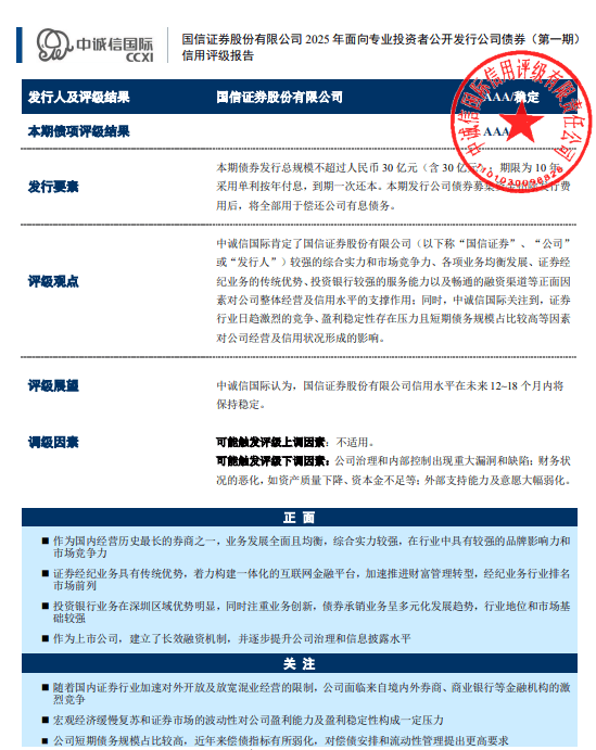 中诚信国际必定了国信证券股份无限公司较强的分析实力和市场所作力、各项营业平衡成长、证券经纪营业的保守劣势、投资银行较强的办事能力以及通顺的融资渠道等反面要素对公司全体运营及信用程度的支持感化;同时,中诚信国际关心到,证券行业日趋激烈的合作、盈利不变性存正在压力且短期债权规模占比力高档要素对公司运营及信用情况构成的影响。