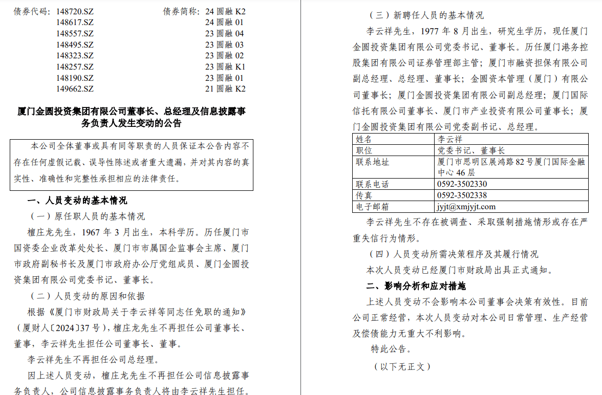 按照《厦门市财务局关于李云祥等同志任夺职的通知》(厦财人〔2024〕37号),檀庄龙先生不再担任厦门金圆投资集团无限公司(简称:金圆集团)董事长、董事,李云祥先生担任公司董事长、董事。李云祥先生不再担任公司总司理。因上述人员变更,檀庄龙先生不再担任公司消息披露事务担任人,公司消息披露事务担任人将由李云祥先生担任。