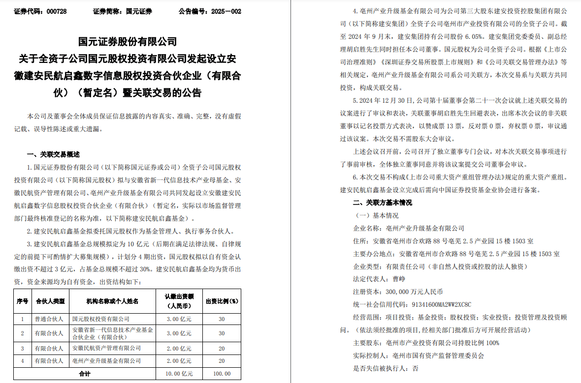 国元证券第十届董事会第二十一次会议于2024年12月30日正在合肥市以现场连系通信表决的体例召开。审议通过《关于全资子公司国元股权投资无限公司倡议设立安徽建安平易近航启鑫数字消息股权投资合股企业(无限合股)(暂命名)暨联系关系买卖的议案》。同意公司全资子公司国元股权投资无限公司(简称:国元股权)做为基金办理人、施行事务合股人以自有资金认缴出资不跨越3亿元,结合其他投资人配合倡议设立安徽建安平易近航启鑫数字消息股权投资合股企业(无限合股)(暂命名,简称:建安平易近航启鑫基金)。鉴于公司大股东建安投资控股集团无限公司(以下简称建安集团)的全资子公司亳州市财产投资无限公司的全资子公司亳州财产升级基金无限公司是该事项的出资人之一,建安集团党委委员、副总司理胡启胜先生同时担任本公司董事,该事项形成公司取联系关系人的配合投资,属于联系关系买卖,联系关系董事胡启胜先生回避表决。审议通过《关于公司2024年度工资总额预算调整方案的议案》。按照公司2024年度现实运营环境,同意公司调整2024年工资总额预算。