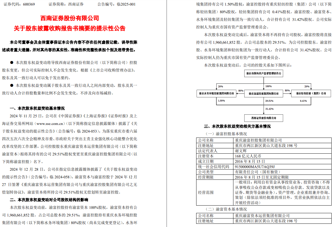 西南证券控股股东沉庆渝富本钱运营集团无限公司(简称:渝富本钱)取沉庆渝富控股集团无限公司(简称:渝富控股)于2024年12月27日签订《沉庆渝富本钱运营集团无限公司取沉庆渝富控股集团无限公司之无偿划转和谈》,渝富本钱将所持公司29。51%股权无偿划转至渝富控股。本次股东权益变更前,渝富控股持有渝富本钱100%股权,渝富本钱持有公司1,960,661,852股,占公司总股本的29。51%;渝富控股持有沉庆水务控股集团无限公司(简称:水务集团)80%股权(尚未完成变动登记),水务集团持有公司1。50%股权;渝富控股持有沉庆轻纺控股(集团)公司(简称:轻纺集团)80%股权,轻纺集团持有公司0。41%股权。渝富控股、渝富本钱、水务集团及轻纺集团为分歧步履人,合计持有公司31。42%股权。公司现实节制报酬国有资产监视办理委员会。本次股东权益变更完成后,渝富本钱将不再持有公司股权,渝富控股将间接持有公司1,960,661,852股,占公司总股本的29。51%,为公司控股股东。渝富控股、水务集团和轻纺集团为分歧步履人,合计持有公司31。42%股权。公司现实节制人仍为国有资产监视办理委员会。本次股东权益变更将导致公司控股股东变动,需按报中国证券监视办理委员会核准,且需待取得上海证券买卖所的合规确认后向中国证券登记结算无限义务公司上海分公司申请打点股份让渡过户登记,具有不确定性。本次股东权益变更不会对公司日常运营勾当形成严沉影响,公司将持续关心本次股东权益变更事项的进展环境,协帮相关消息披露权利人按履行消息披露权利,敬请泛博投资者留意投资风险。