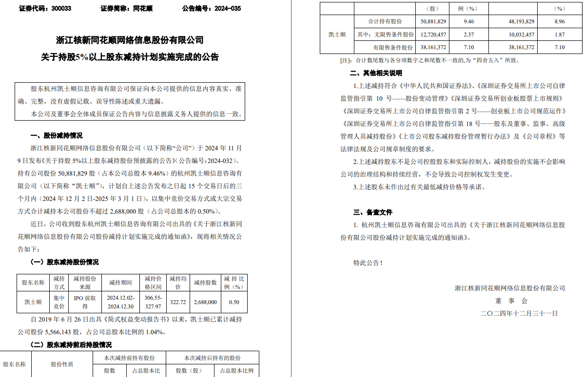 浙江核新同花顺收集消息股份无限公司(同花顺)于2024年11月9日发布《关于持股5%以上股东减持股份预披露的通知布告》(通知布告编号:2024-032)。持有公司股份50,881,829股(占本公司总股本9。46%)的杭州凯士顺消息征询无限公司(简称:凯士顺),打算自上述发布之日起15个买卖日后的三个月内(2024年12月2日-2025年3月1日),以集中竞价买卖体例或大买卖体例合计减持不跨越2,688,000股(占公司总股本的0。50%)。近日,公司收到股东凯士顺出具的《关于同花顺股份减持打算实施完成的通知函》,自 2019年6月26日出具《简式权益变更演讲书》以来,凯士顺已累计减持公司股份5,566,143 股,占总股本比例的 1。04%。